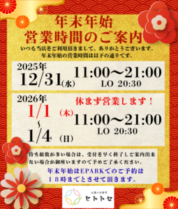 年末年始はEPARKでの予約受付は18時までとさせていただきます。